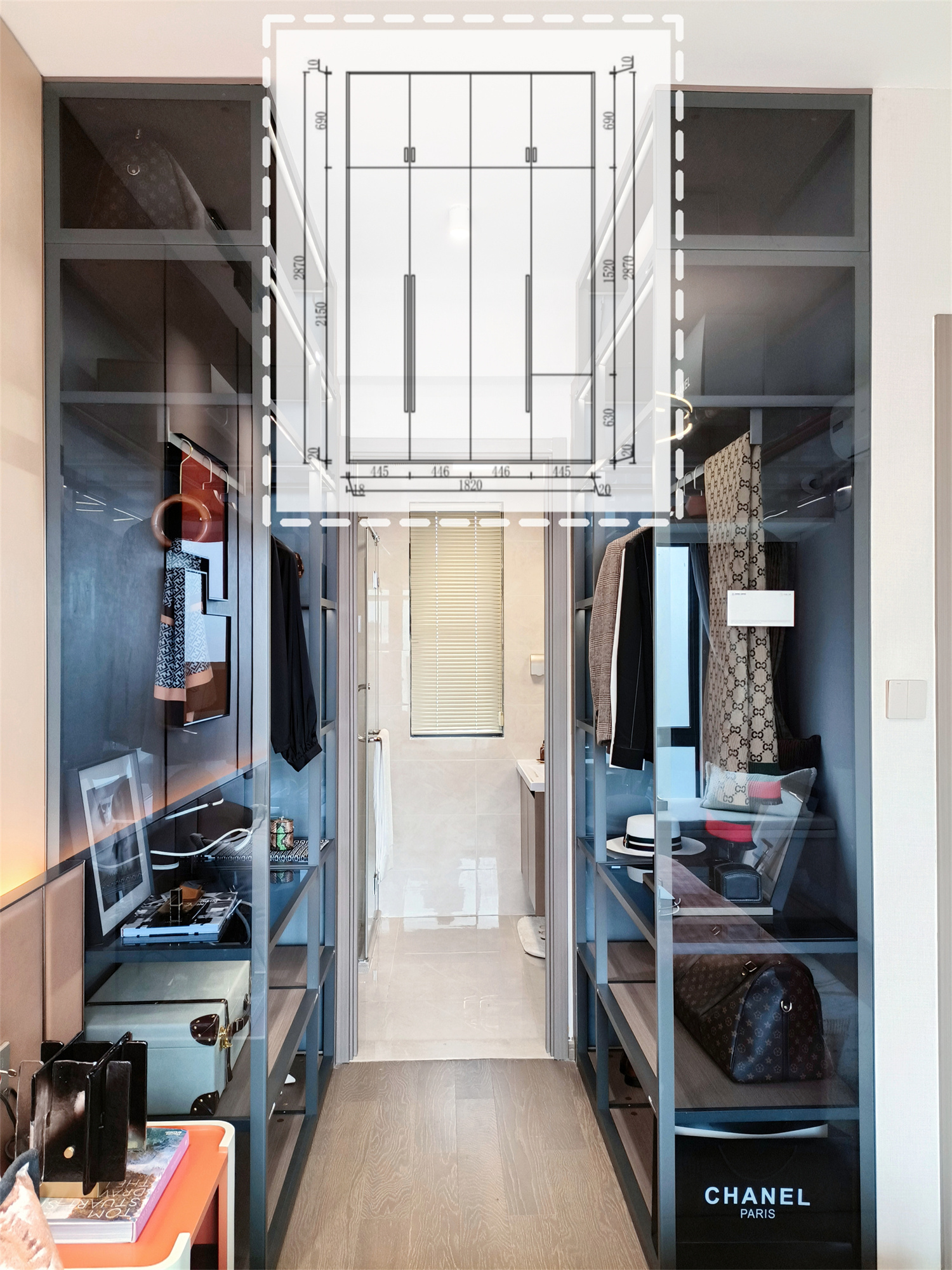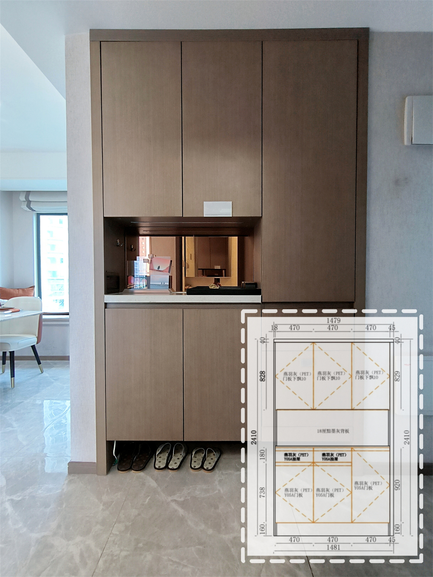 由于收纳需要,上方做了收纳柜,可以收纳一些过季的鞋子,衣架或是一些储物等,原木色的柜门面板也是比较高等百搭了