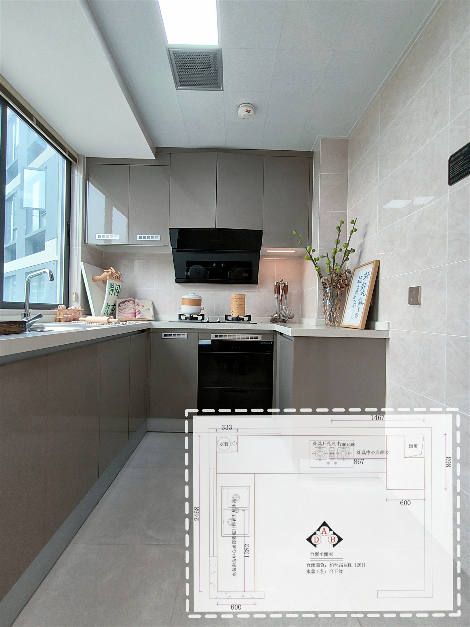 不常用的锅碗瓢盆或者各种锅碗瓢盆一般都放在厨房水槽区域,可以通过搁板增加层高空间。