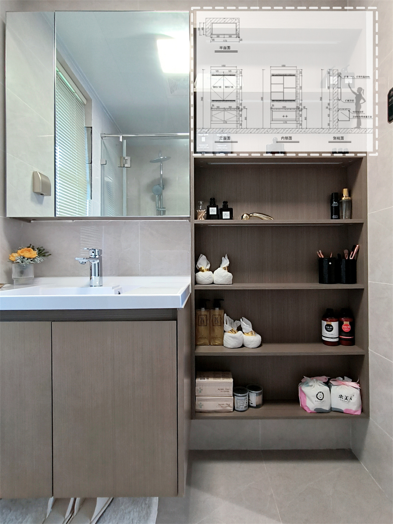 浴室台面的设计也要遵循 "藏8露2 "的原则。