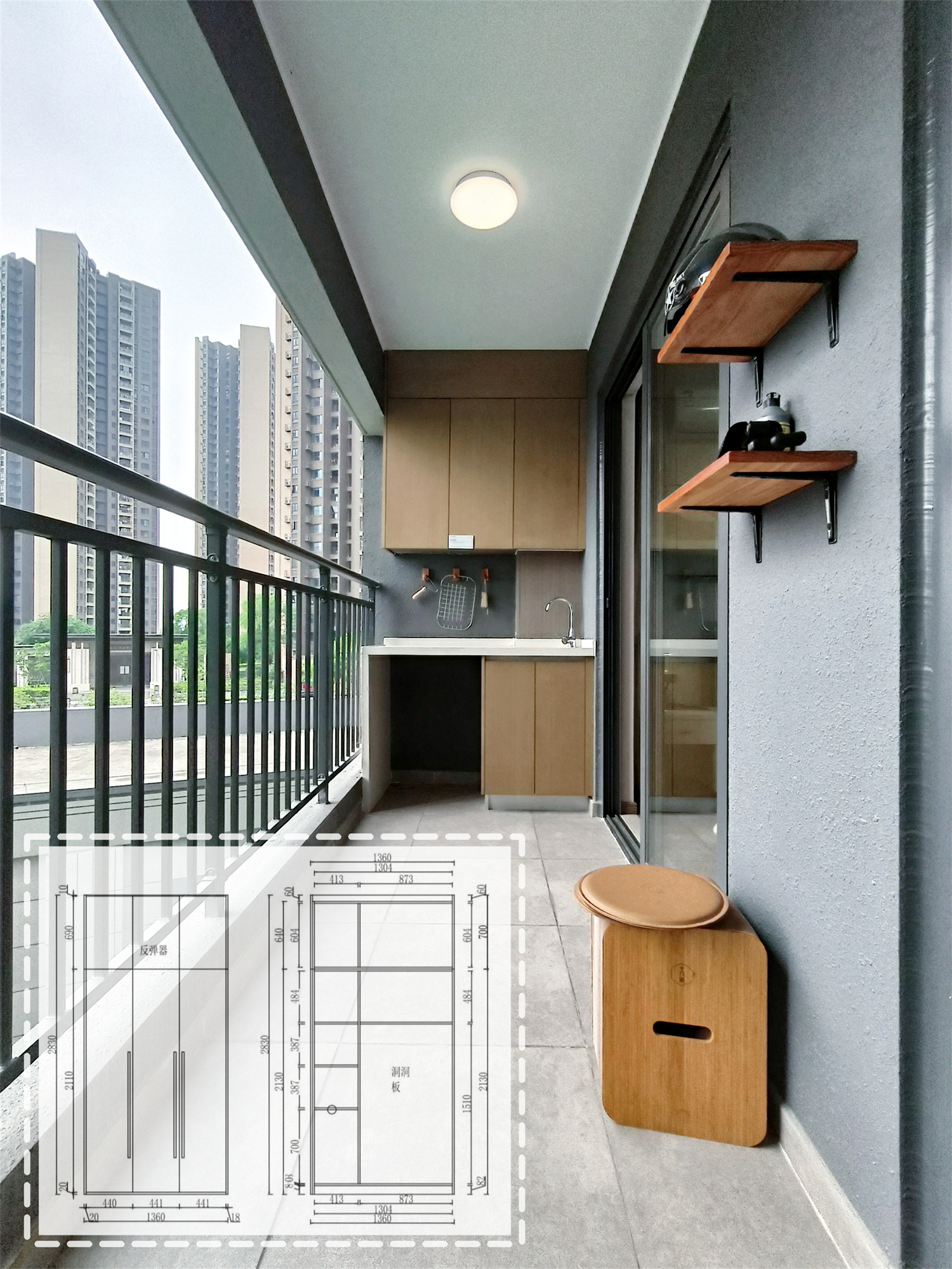 将阳台空间利用比较大化,下方提前预留洗衣机的空间,洗衣机内嵌节省空间,又美观!