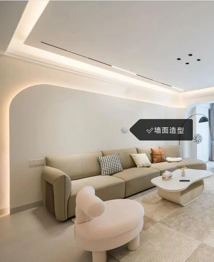 现在很多装修友友为了增加空间立体感和设计感,会对墙面造型进行设计,常见的就是墙面弧度,利用石膏板做弧度造型,连接沙发背景墙与阳台隔断墙,后期根据墙面材质进行表面装饰皆可。