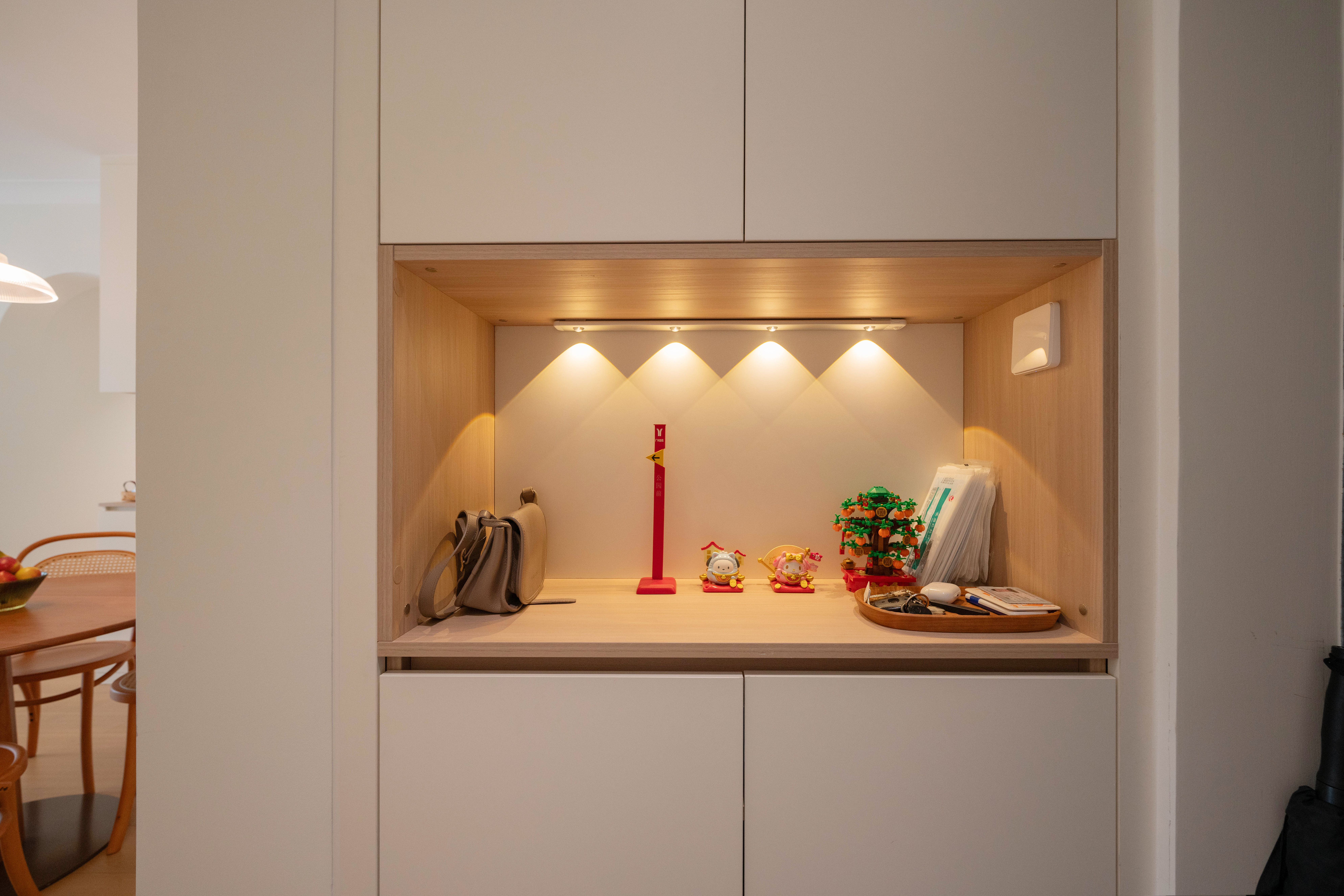 在广州装修设计中,玄关是家的“门面”。基础照明可选筒灯,营造温馨光感;玄关柜内部加装感应灯带,方便穿脱鞋物;色温把控在4500~5000K之间,既明亮又不刺眼。