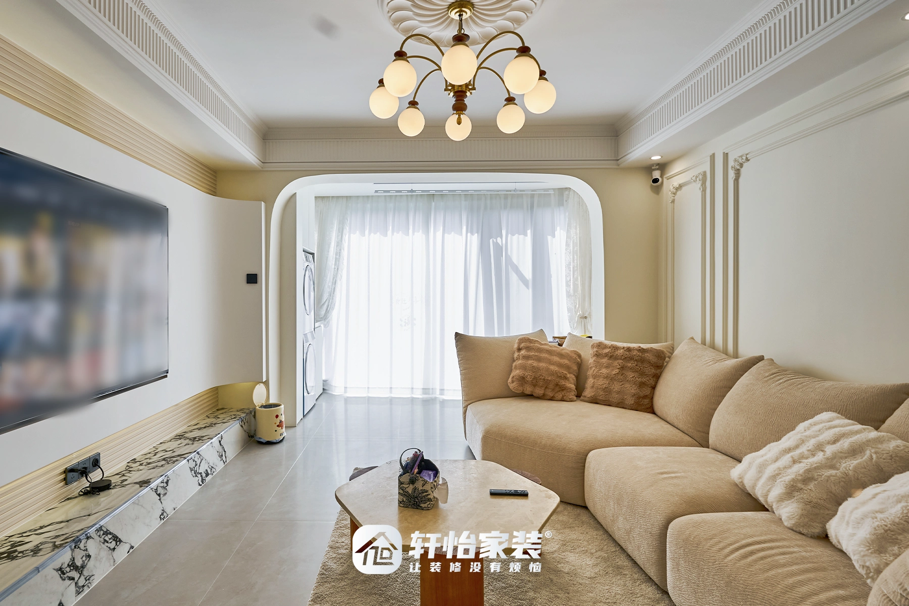 布艺是软化空间的关键。窗帘建议选择轻盈有垂坠感的材质,如绒布、棉麻或纱帘,颜色以纯色为主,做成满墙落地式,更显大气。