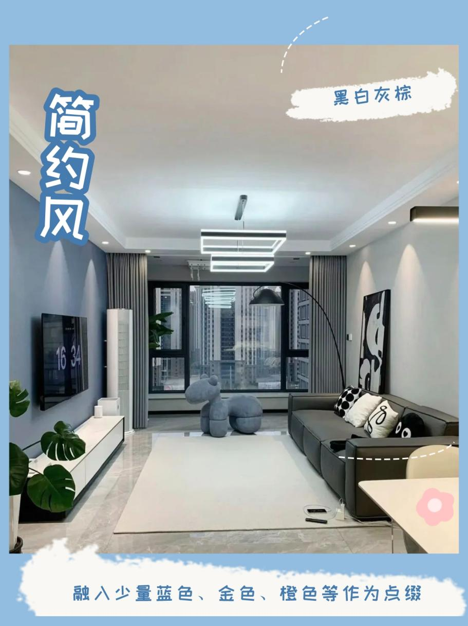 简约风:黑白灰棕,再融入少量蓝色、金色、橙色等作为点缀,构建整屋的简约风情。