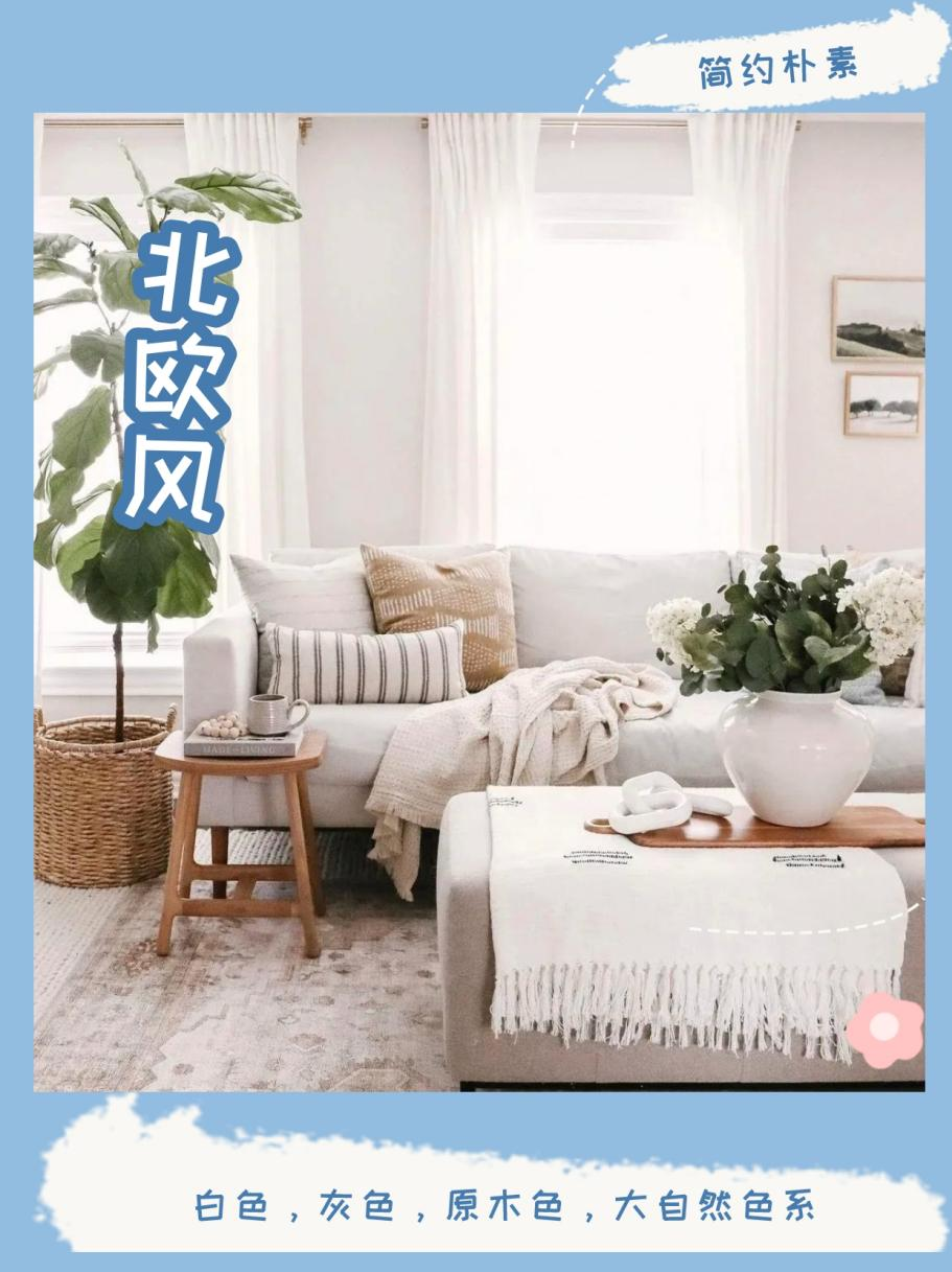 北欧风:白色,灰色,原木色,大自然色系,简约朴素。