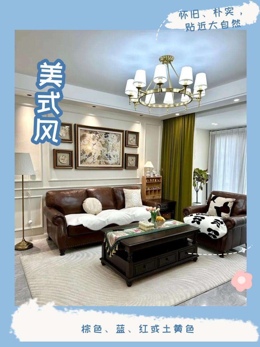 美式:棕色、蓝、红或土黄色,看起来比较怀旧、朴实,贴近大自然,这也是美式装修区别于其它装修风格的特质所在。