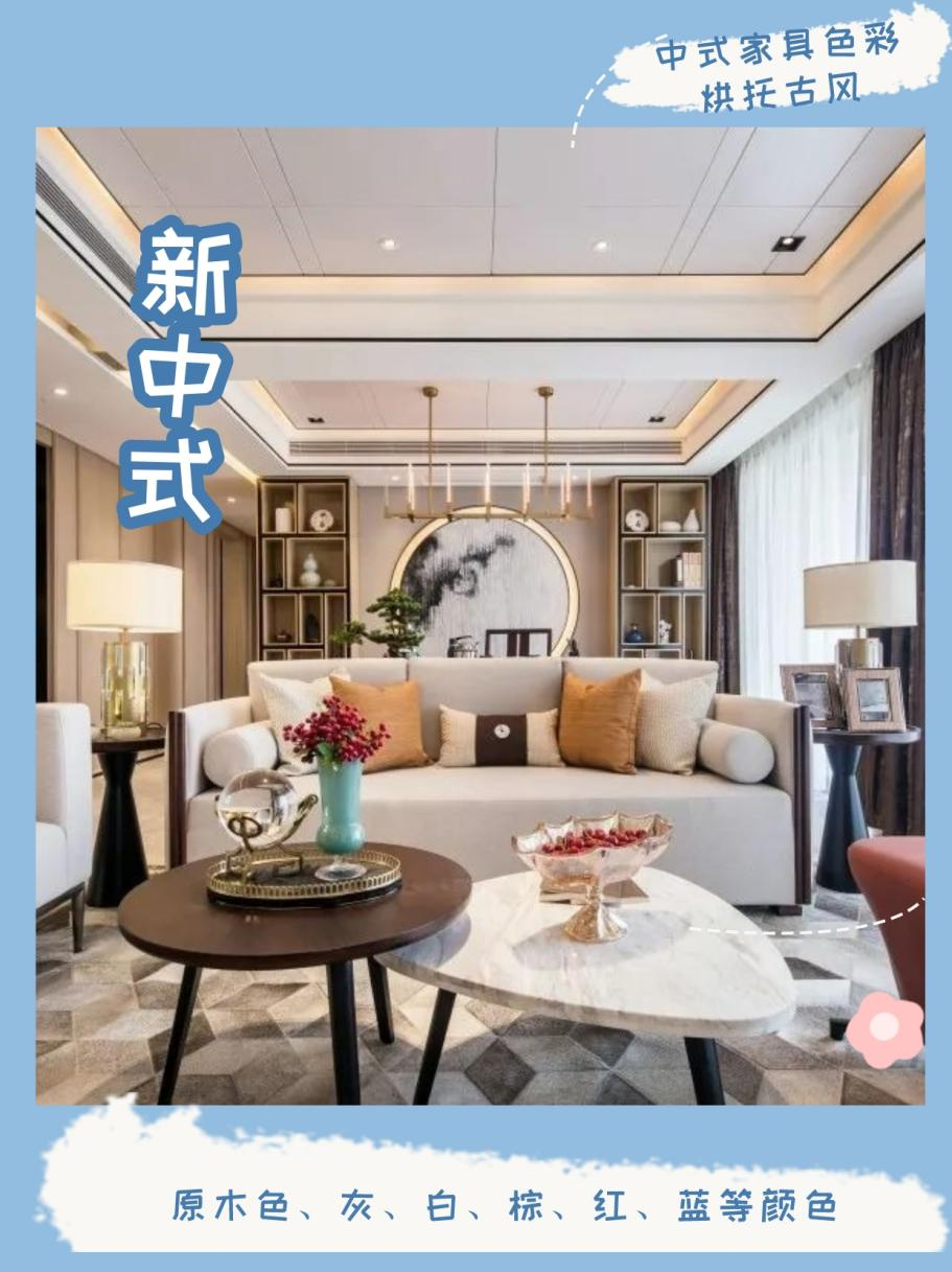新中式:一般采用原木色、灰、白、棕、红、蓝等颜色,中式家具色彩一般比较深,从而更好烘托古风。
