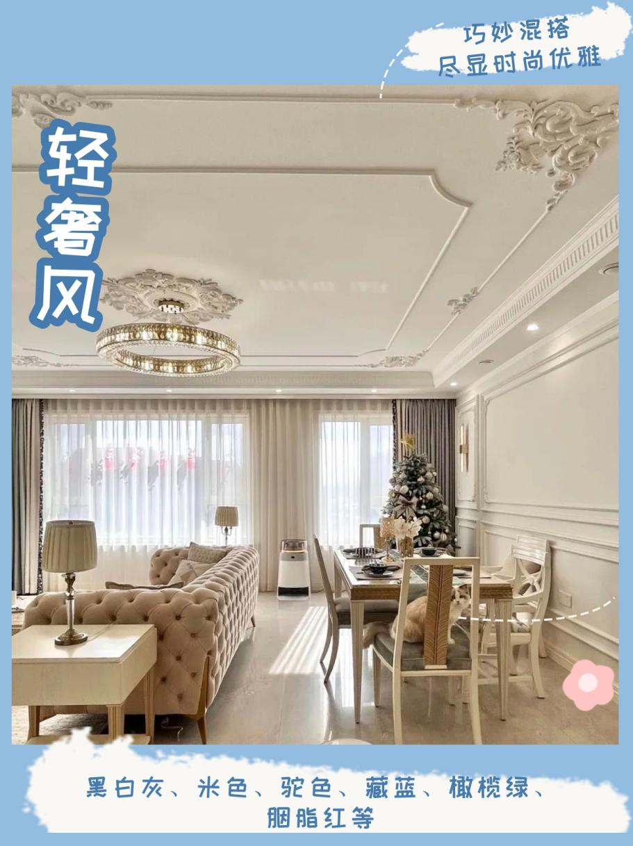 轻奢风:一般会选用黑白灰、米色、驼色、藏蓝、橄榄绿、胭脂红等带有质感的色彩,通过巧妙混搭让空间气质得以提升,尽显时尚优雅。