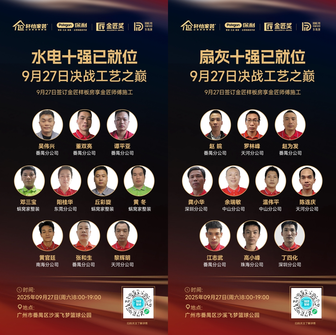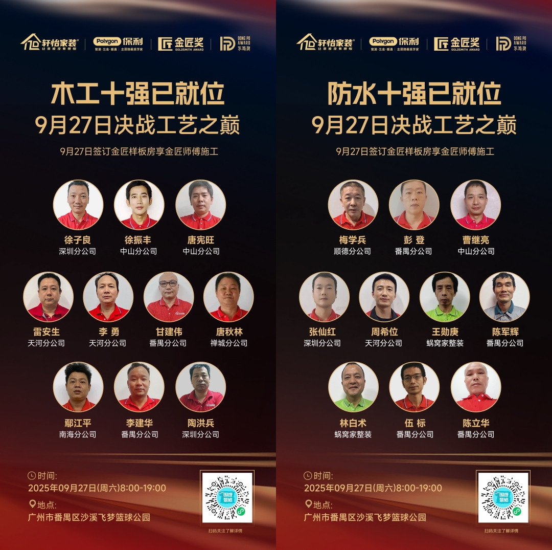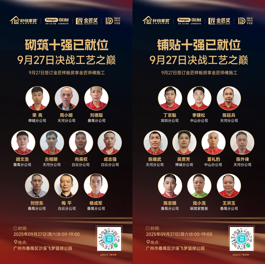 9月27日,轩怡家装2025“金匠奖”总决赛战鼓擂响。近千名自有产业工人中的高手,将齐聚一堂,展开一场关于工艺、匠心与品质的较量。这不仅是一场技艺的“华山论剑”,更是对业主未来家居品质的硬核承诺。