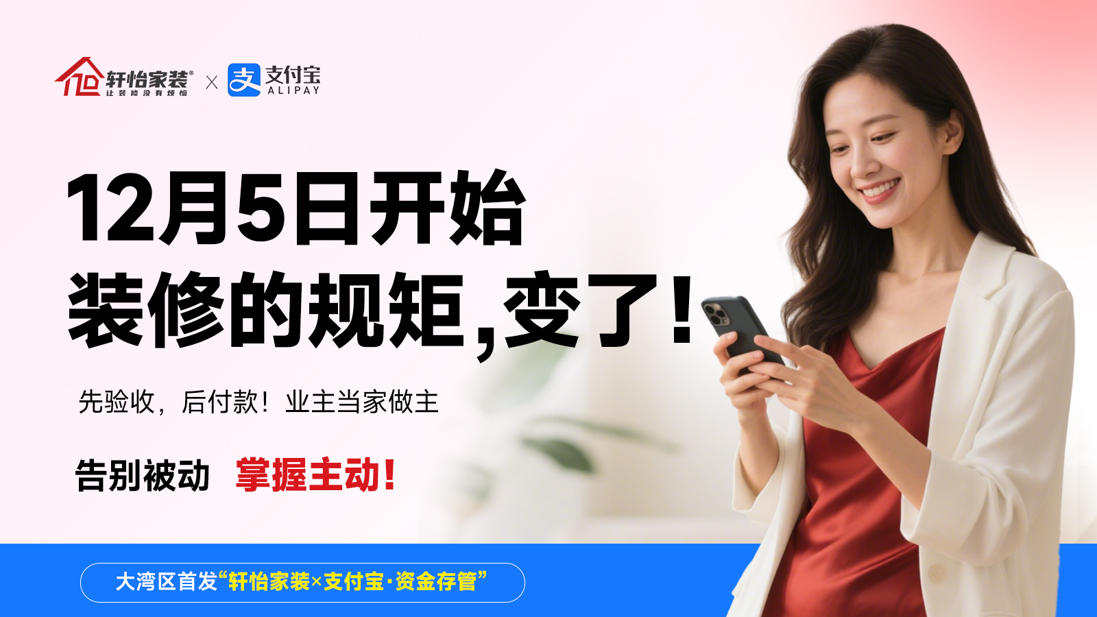 2025年12月5日,轩怡家装将与支付宝正式达成共同合作,携手推出行业率先次提出的“装修款存管”可信装修解决方案。这不仅是双方基于推动行业健好发展共同愿景的强强联合,更是大湾区家装服务标准升级的重要里程碑。