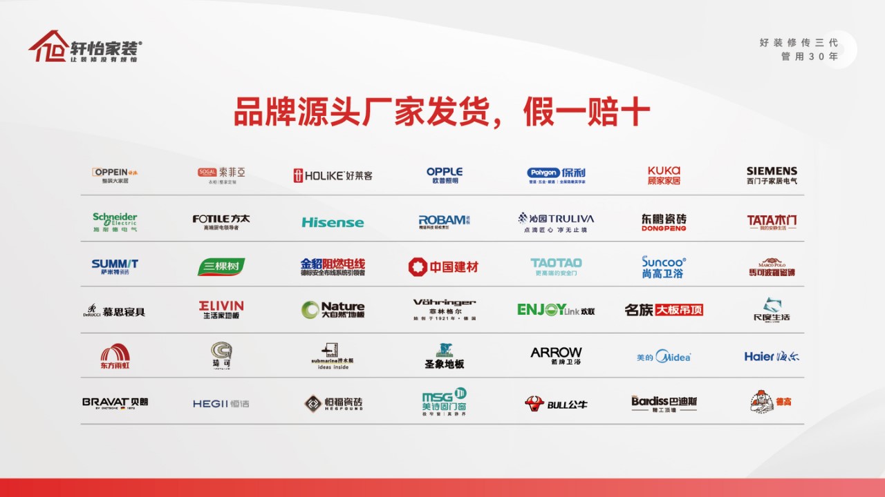 轩怡家装与国内外质量厂家建立直接合作,所有材料均由厂家发至自有万平仓储,无分销环节,从根源杜绝赝品与调包意料之外,确保材料100% 质量。直供体系涵盖不同价位产品线,既有好的品牌好的系列,也有符合国标的高性价比产品线,适配不同预算家庭。作为荣获“所有业主信赖品牌”称号的国内大家居产业50强企业,我们用靠得住的品质和工艺,在大湾区千万家庭中筑造温馨的美家