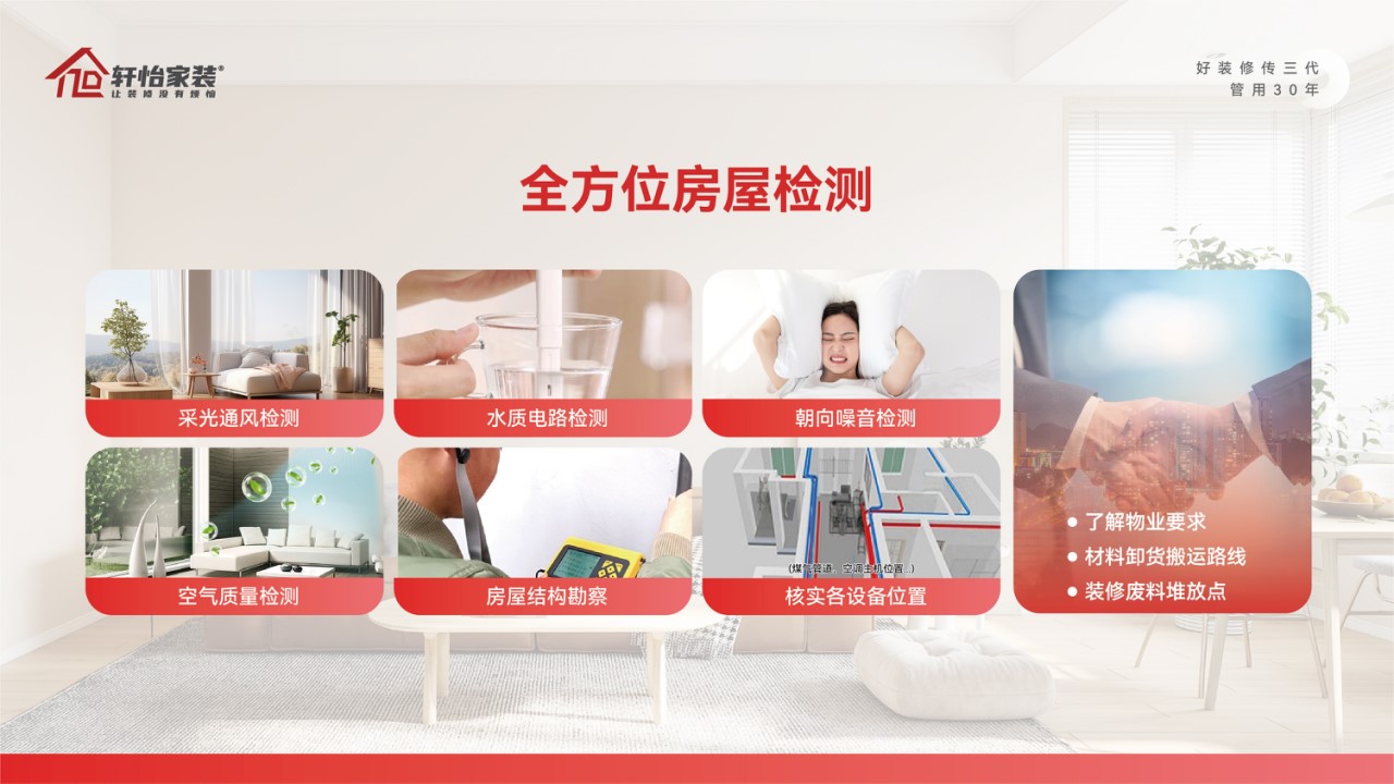 正确适配,重要是让材料性能精细对接居住需求。依托 “装修全流程 6 大靠谱体系” 中的好量房服务,轩怡家装团队选材前,会依据量房的9大检测数据(如采光通风、噪音、空气质量等),结合业主的家庭结构、生活习惯与未来规划等进行针对性推荐。