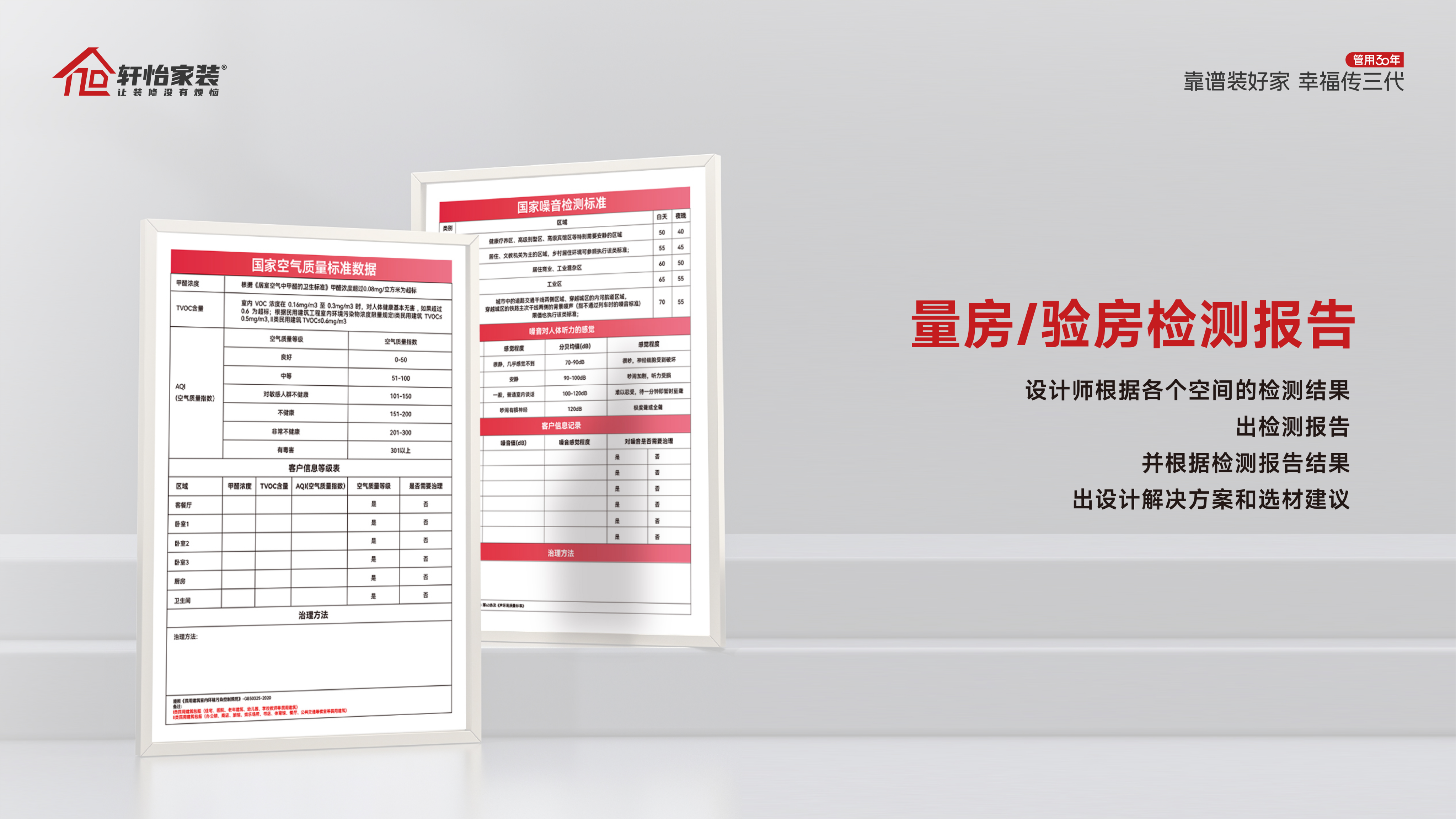 设计师根据各个空间的检测结果,出检测报告,并根据检测报告结果,出设计解决方案和选材建议