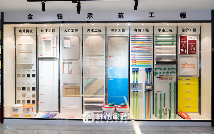 轩怡家装的珠海直营门店,设立了丰富的实景选材区,主辅材、家居配件一目了然。业主可亲手触摸质感、对比色泽,不必费力跑市场。