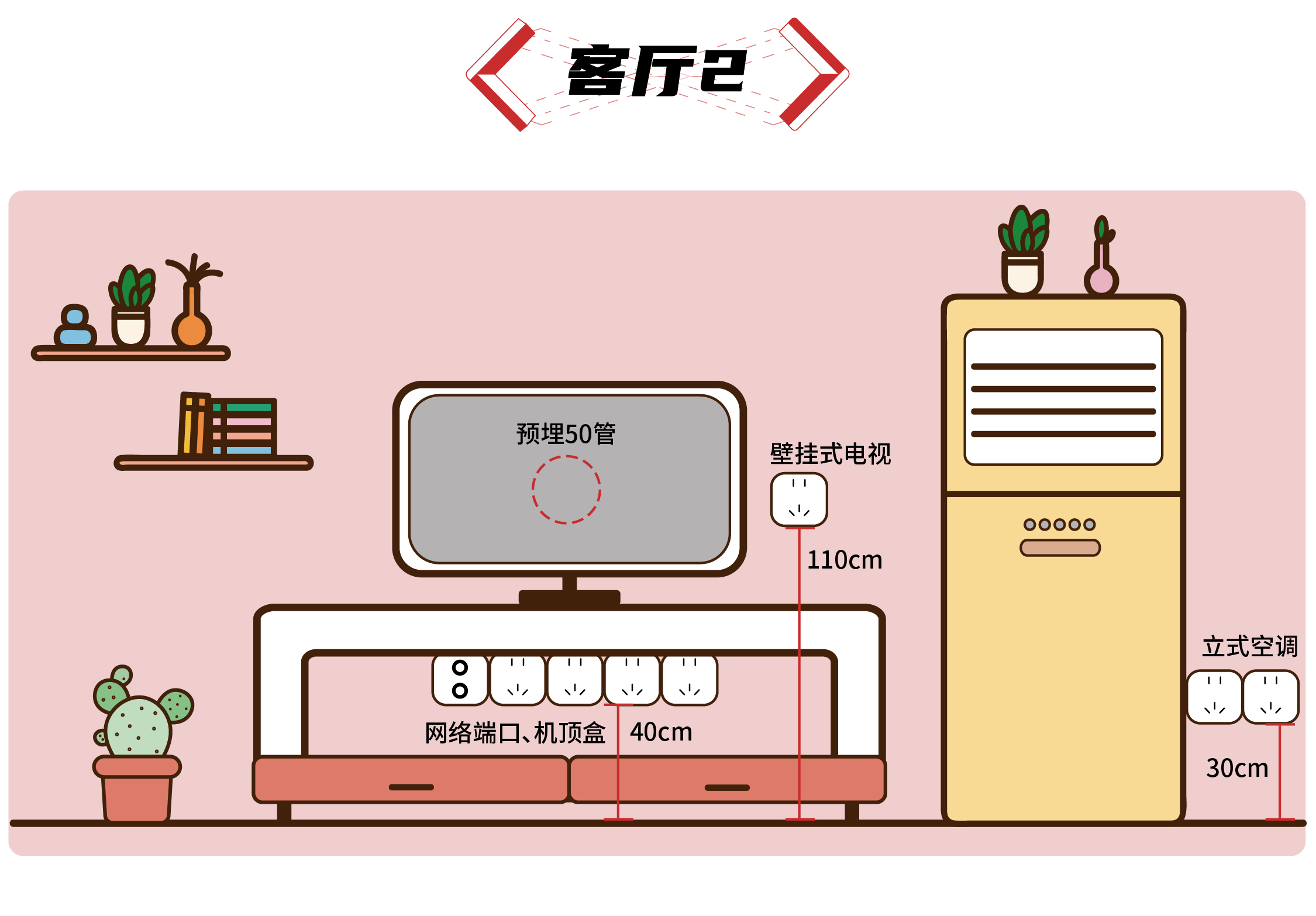 ①客厅电视墙、沙发旁、阳台预留插座数量;