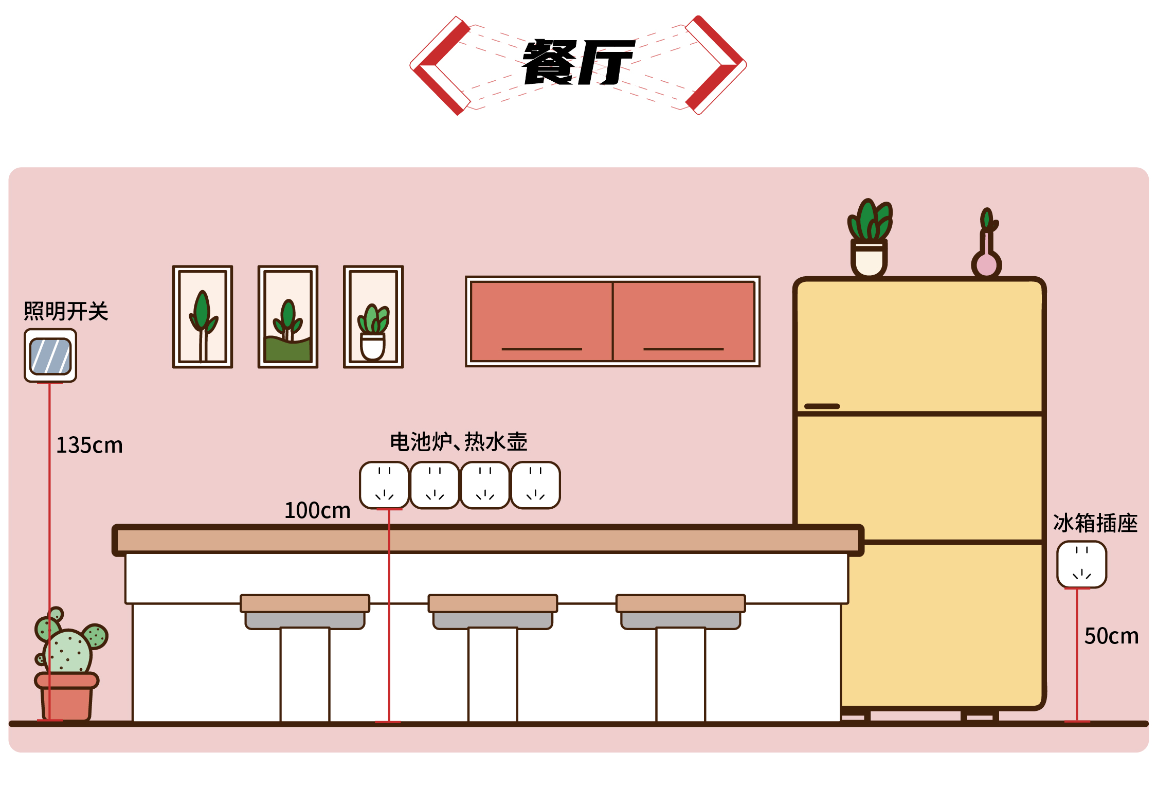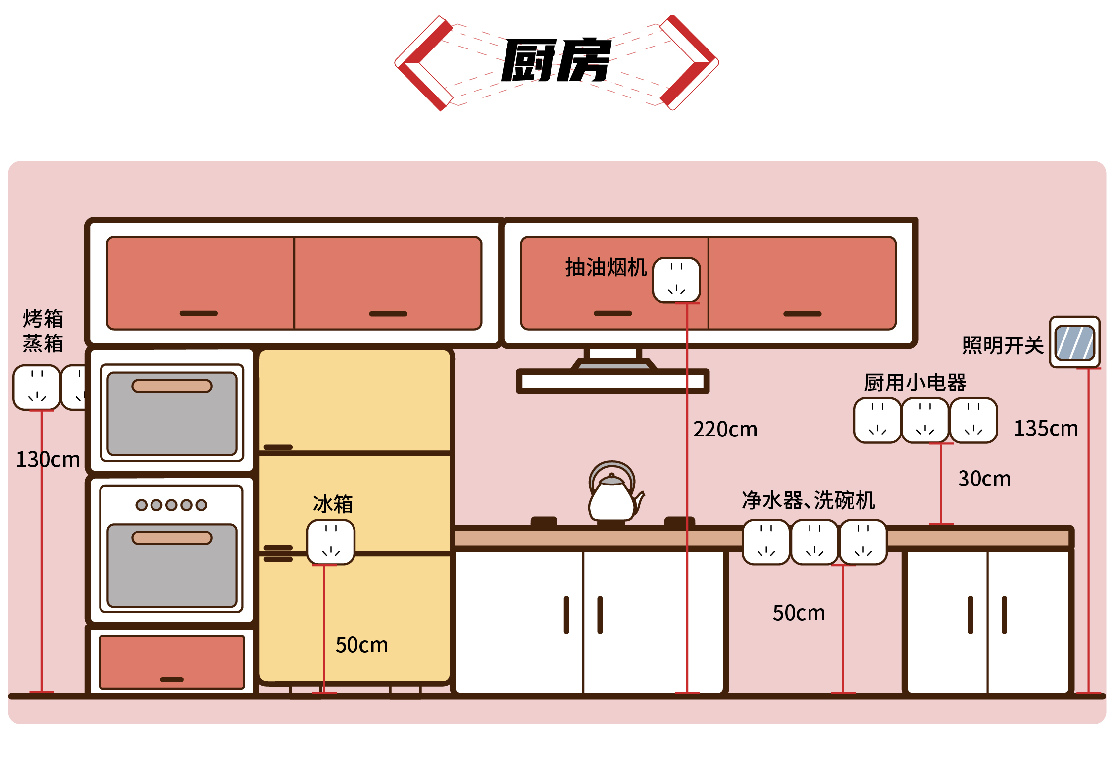 ②厨房操作台、电饭煲、微波炉、洗碗机插座位置;
